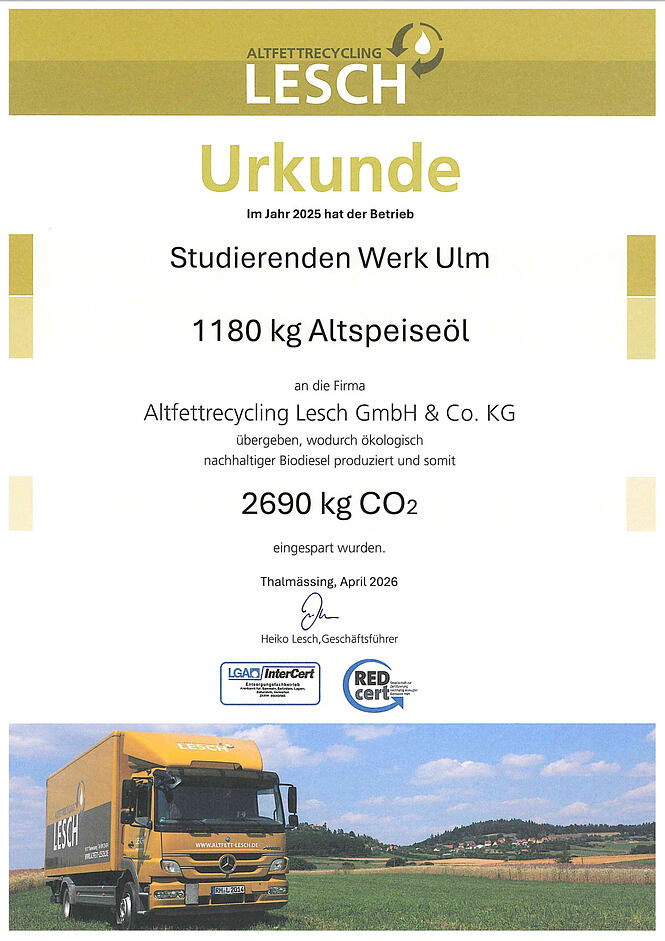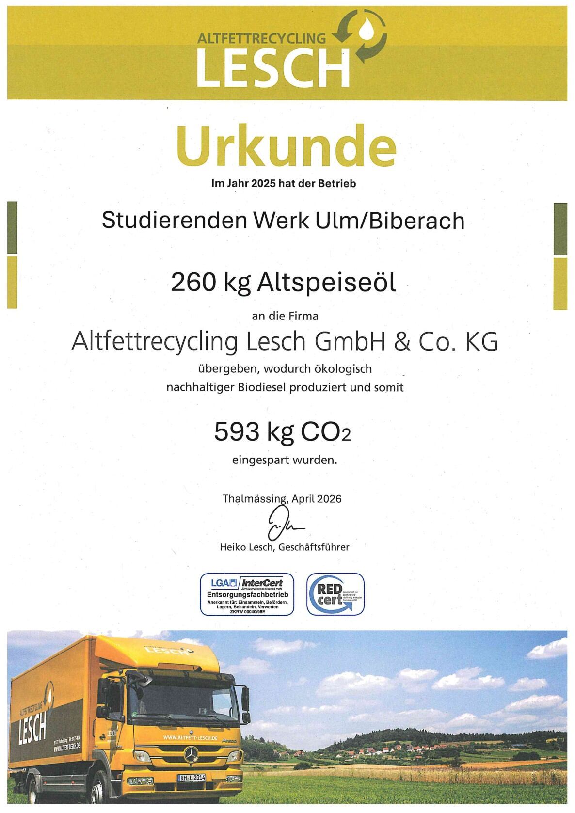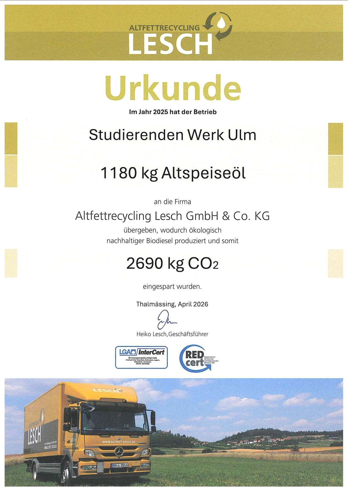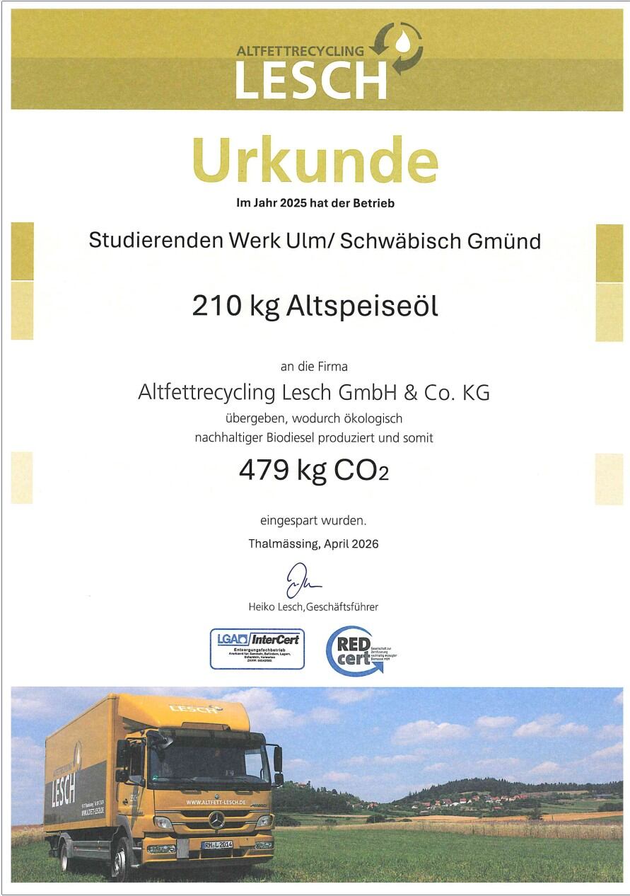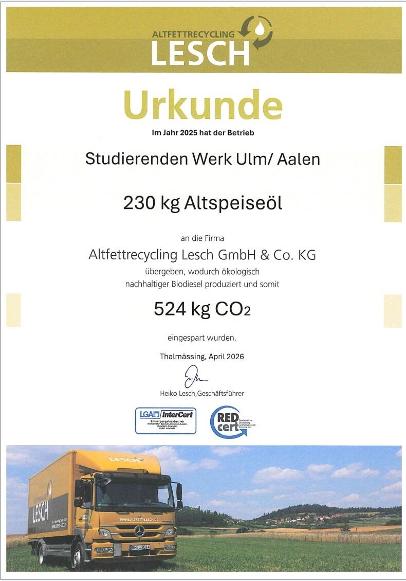- Seit 2019 übergibt die Campusgastronomie des Studierendenwerkes Ulm Altspeiseöl an die Firma Altfettrecycling Lesch GmbH & Co. KG, wodurch ökologisch nachhaltiger Biodiesel produziert wird und CO2-Emissionen eingespart werden. Im Jahr 2023 ergab sich daraus eine Einsparung von 5.107 kg CO2 durch das Recycling von 2.240 kg Altspeiseöl.