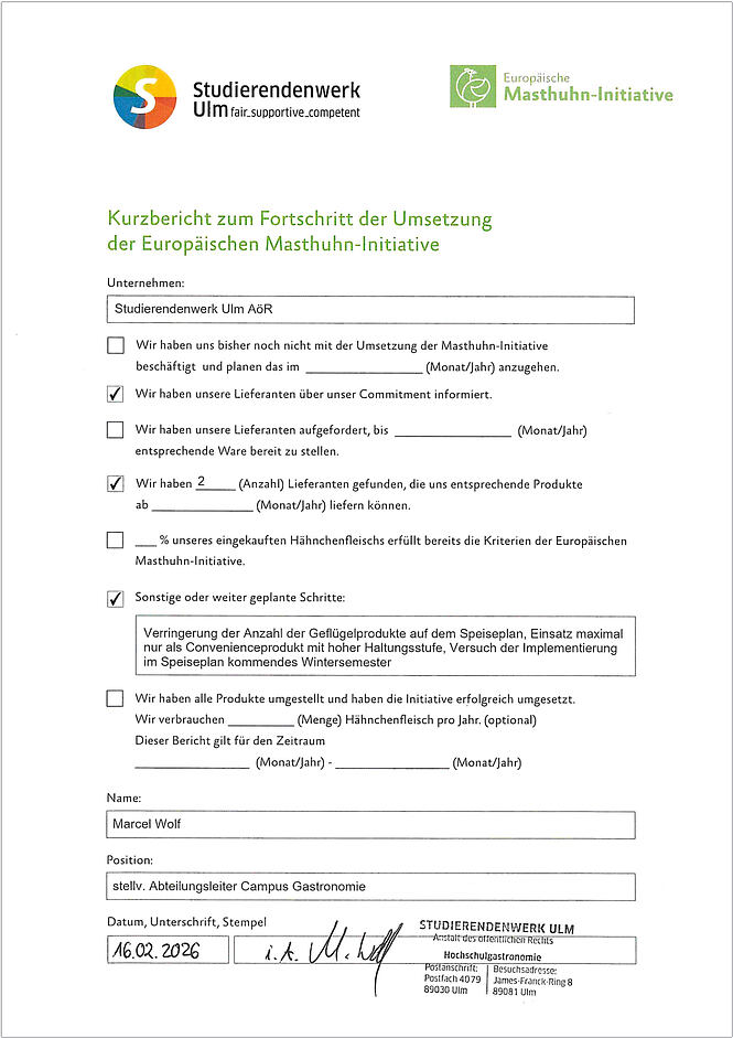 - Das Studierendenwerk Ulm ist bemüht, die Anforderungen der Europäischen Masthuhn-Initiative für 100 % des bezogenen Hühnerfleisches bis 2026 umzusetzen. Zum Fortschritt der Umsetzung veröffentlicht das Studierendenwerk Ulm jährlich Berichte und lässt durch unabhängige Kontrollen die Einhaltung der Standards sicherstellen. Bis Fleisch zur Verfügung steht, das alle Kriterien der Europäischen Masthuhn-Initiative erfüllt, wird das Studierendenwerk Ulm auf ähnliche Angebote zurückgreifen und deren Anteil im Sortiment sukzessive erhöhen. Die Europäische Masthuhn-Initiative entstammt einem Zusammenschluss von rund 30 Tierschutzorganisationen mit dem wesentlichen Ziel, die Haltung von Masthühnern zu verbessern. Dabei werden wichtige Tierschutz-Aspekte wie eine geringere Besatzdichte, die Einschränkung der Überzüchtung sowie Mindeststandards für Licht und Beschäftigungsmaterial umgesetzt.
